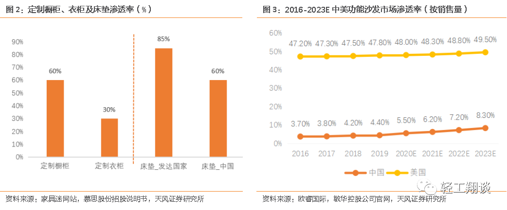 (3)功能沙發(fā):從量的角度2019年國內(nèi)功能沙發(fā)銷售量滲透率約4.4%,從銷售額角度國內(nèi)功能沙發(fā)滲透率約為12%,而2019年美國功能沙發(fā)滲透率為41.5%。