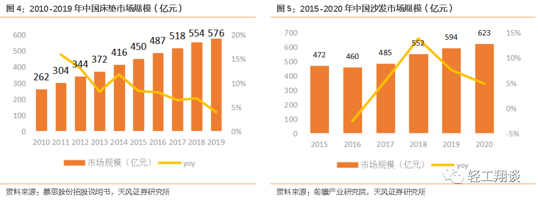 軟體家具:根據(jù)前瞻產(chǎn)業(yè)研究院數(shù)據(jù),2020年沙發(fā)行業(yè)規(guī)模約為623億元,保守假設行業(yè)規(guī)模維持平穩(wěn),2020年顧家、敏華內(nèi)銷沙發(fā)市占率分別為5%、6%。根據(jù)慕思股份招股說明書,2019年床墊行業(yè)規(guī)模576億元,保守假設行業(yè)規(guī)模維持平穩(wěn),2020年喜臨門、慕思內(nèi)銷床墊市占率分別為4%、7%。