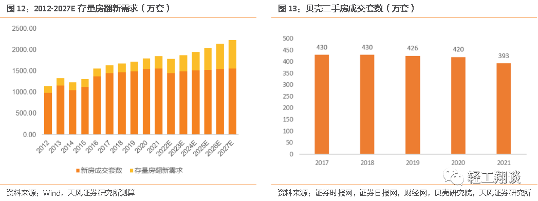 根據(jù)貝殼研究院數(shù)據(jù),全國二手房年平均交易量約為400萬套,占住房交易的20%,二手房交易熱度和房價相關性更高,而存量房更新需求和房齡及消費能力更相關,和居民對品質(zhì)住房的要求更相關。根據(jù)貝殼研究院數(shù)據(jù),2021年全國二手房成交套數(shù)約393萬套,同比下滑約6.4%,近幾年年平均二手房成交套數(shù)約為400萬套左右,假設新房銷售套均面積為100平米/套,2021年全國新房和二手房銷售套數(shù)合計將近2000萬套,二手房交易占比約20%。