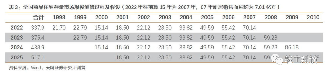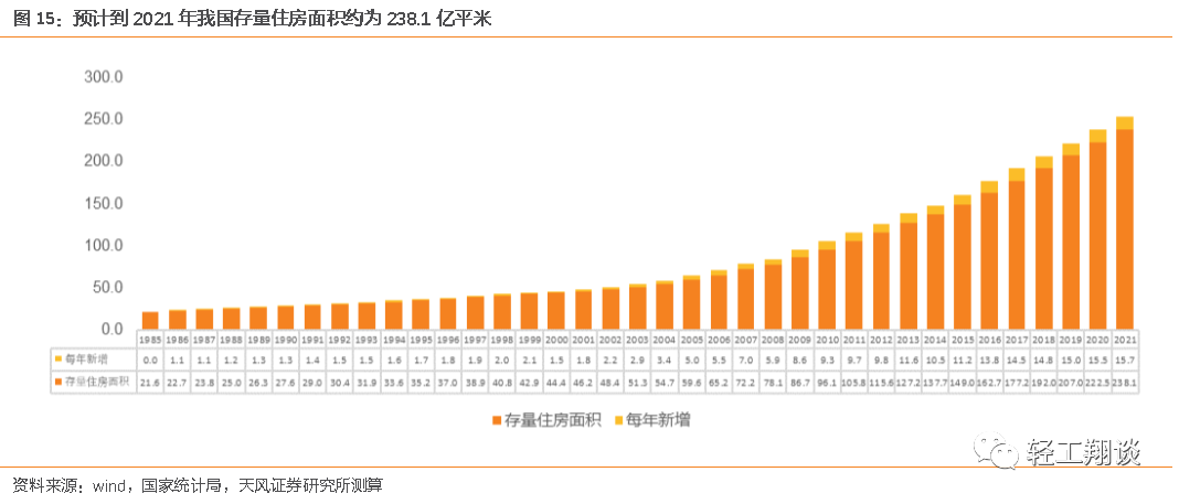 每年存量更新需求:2022-2025年城鎮(zhèn)商品住宅存量翻新套數(shù)預計分別為338、375、439、517萬套。假設存量商品房15年翻新一次,每年翻新比例為10%,平均住宅面積為100平米/套。