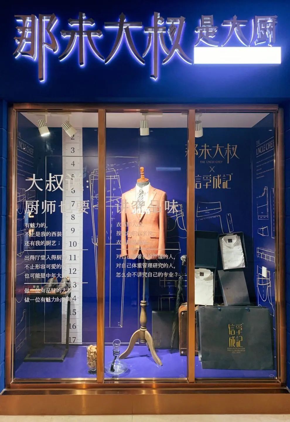 店內(nèi)用《王牌特工》的電影概念來裝修,有speak easy暗室;同時(shí)“那未大叔”還與廣州百年西裝品牌信孚誠記和高端復(fù)古的Mustard Barber芥末男士理發(fā)店跨界合作,在店內(nèi)陳列有定制西裝和復(fù)古皮質(zhì)理發(fā)椅等,以及領(lǐng)帶、領(lǐng)結(jié)、量體皮尺等細(xì)節(jié)。
