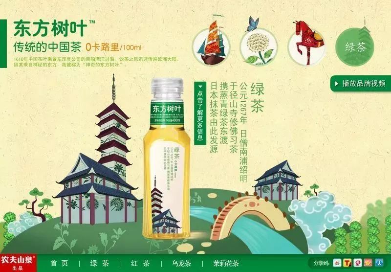 東方樹葉,讓人聯(lián)想到中國悠久的、令人驕傲的飲茶史。這個(gè)品牌在打造時(shí)也是強(qiáng)調(diào)了這一點(diǎn),其最具代表性的廣告文案是:“公元1267年,蒸青綠茶東渡日本;貞觀15年,紅茶經(jīng)茶馬古道傳入西域;17世紀(jì),中國烏龍風(fēng)行英倫;傳統(tǒng)的中國茶,神奇的東方樹葉。”