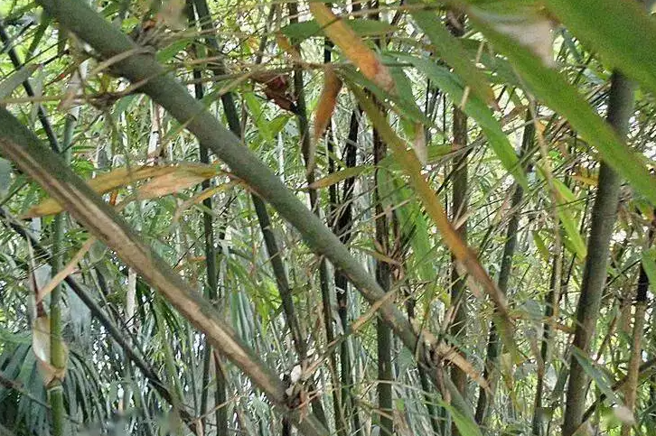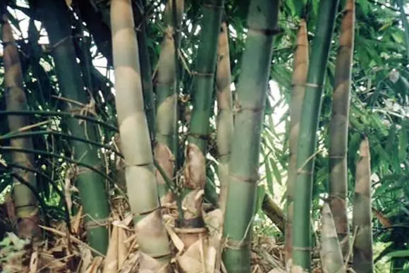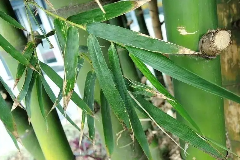 地下莖合軸縱生,竹竿直立,先端稍下垂,高8-12m,胸徑5-6cm,節間長35-50cm,竹壁薄,僅3-5mm。幼竿深綠色,被有明顯白粉和倒生刺毛,以后逐漸脫落。
