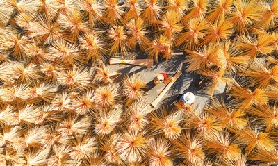 浙江省杭州市淳安縣中洲鎮樟村村竹制品廠工人搶抓晴好天氣整理晾曬竹條。謝航凱攝(人民視覺)