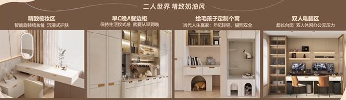 晨光奶咖——屬于二人世界的精致空間,親密無間中劃分出各自的愜意與自在,還少不了氛圍感與儀式感的充分營造。2023小紅書家居最火爆風格“輕法奶油風”,整體奶白主色調,采用簡約輕法式門型,時光菱格背板點綴吸睛,柔和弧度轉角,搭配全屋同色系及柔軟家具,目之所及皆是溫柔。智能旋轉梳妝鏡,打造沉浸式護膚的精致梳妝區;早C晚A餐邊柜,保持生活儀式感;專屬定制寵物窩,共享美好時光;雙人電腦區超長臺面,讓休閑辦公都自得其樂。
